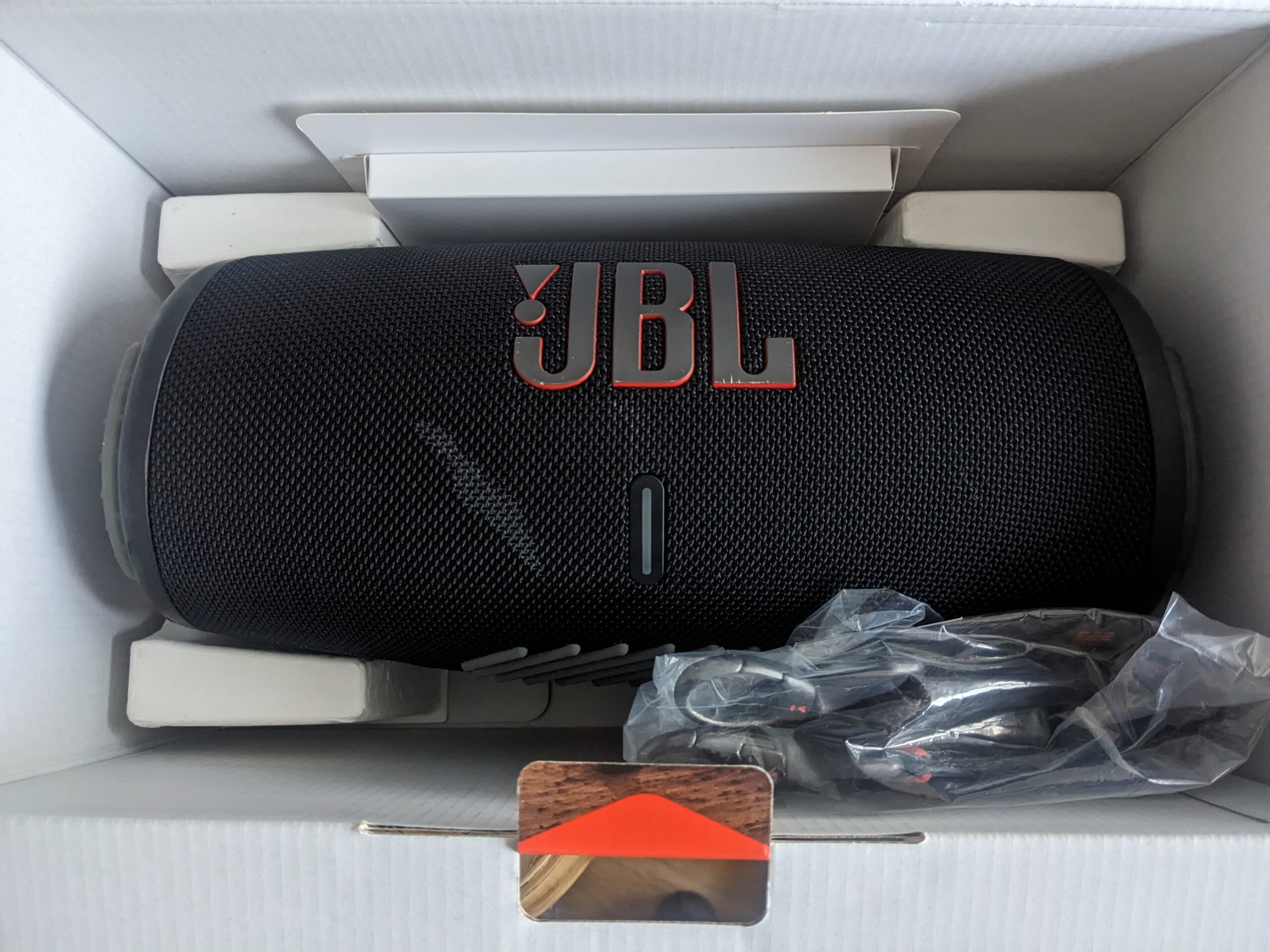 ⚠️ Būklė B : Naudota. Techninė būklė puiki. Vizualinė būklė: yra viena dėmė (matoma pridėtose nuotraukose), kuri neturi jokios įtakos garso kokybei. Mažai naudota. Originali pakuotė. Yra JBL nešiojimo dirželis.