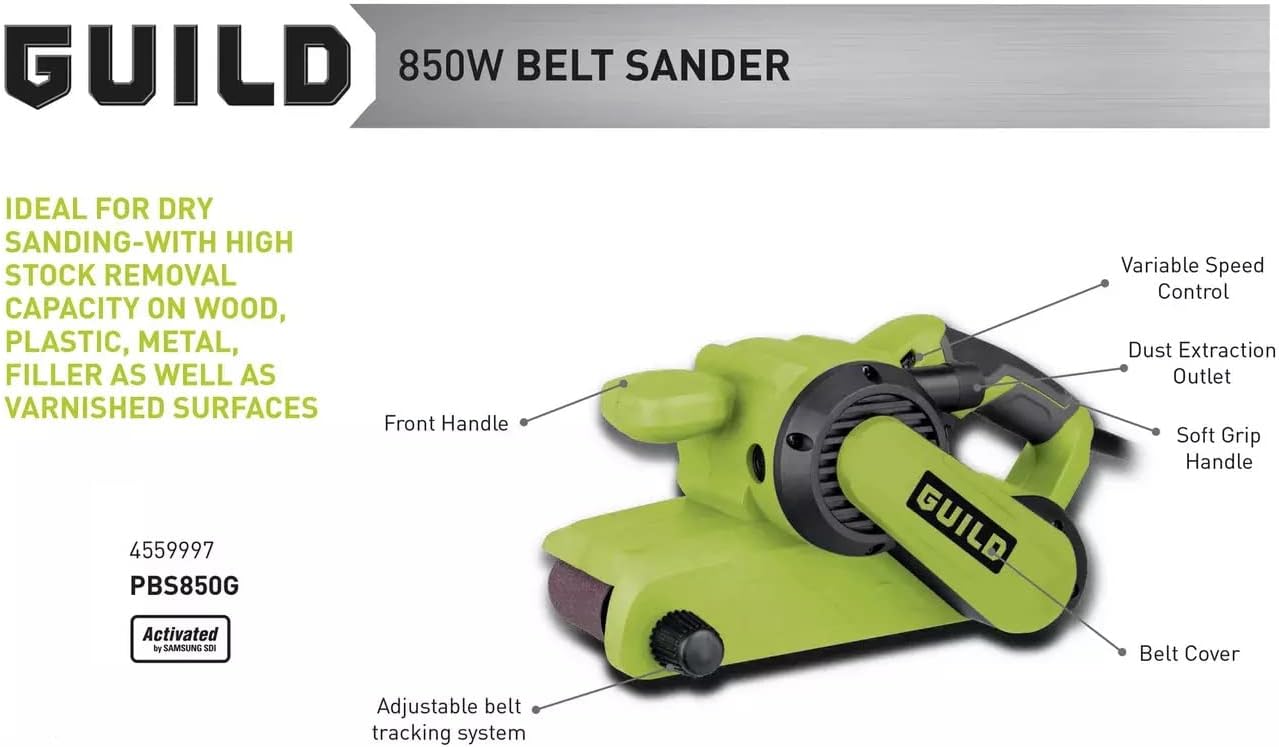 „Guild“ 850W juostinis šlifuoklis (vadinamas „tanku“) idealiai tinka darbams, kur reikia nušlifuoti daug medienos per trumpą laiką. Tai nepakeičiamas įrankis atnaujinant grindis, terasas ar senus masyvius stalus.