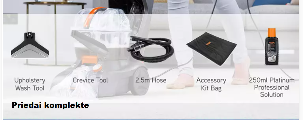 • Universalumas: Su komplekte esančia 2,5 m žarna ir specialiais antgaliais lengvai pasieksite laiptus, kampus bei atnaujinsite minkštų baldų estetinę išvaizdą.