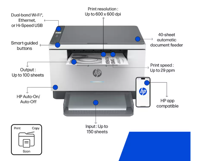 • Išmanus valdymas: Naudodami HP Smart programėlę, galite skenuoti aukšta kokybe tiesiai į telefoną, „Dropbox“ ar „Google Drive“ bei užsisakyti tonerį automatiškai.