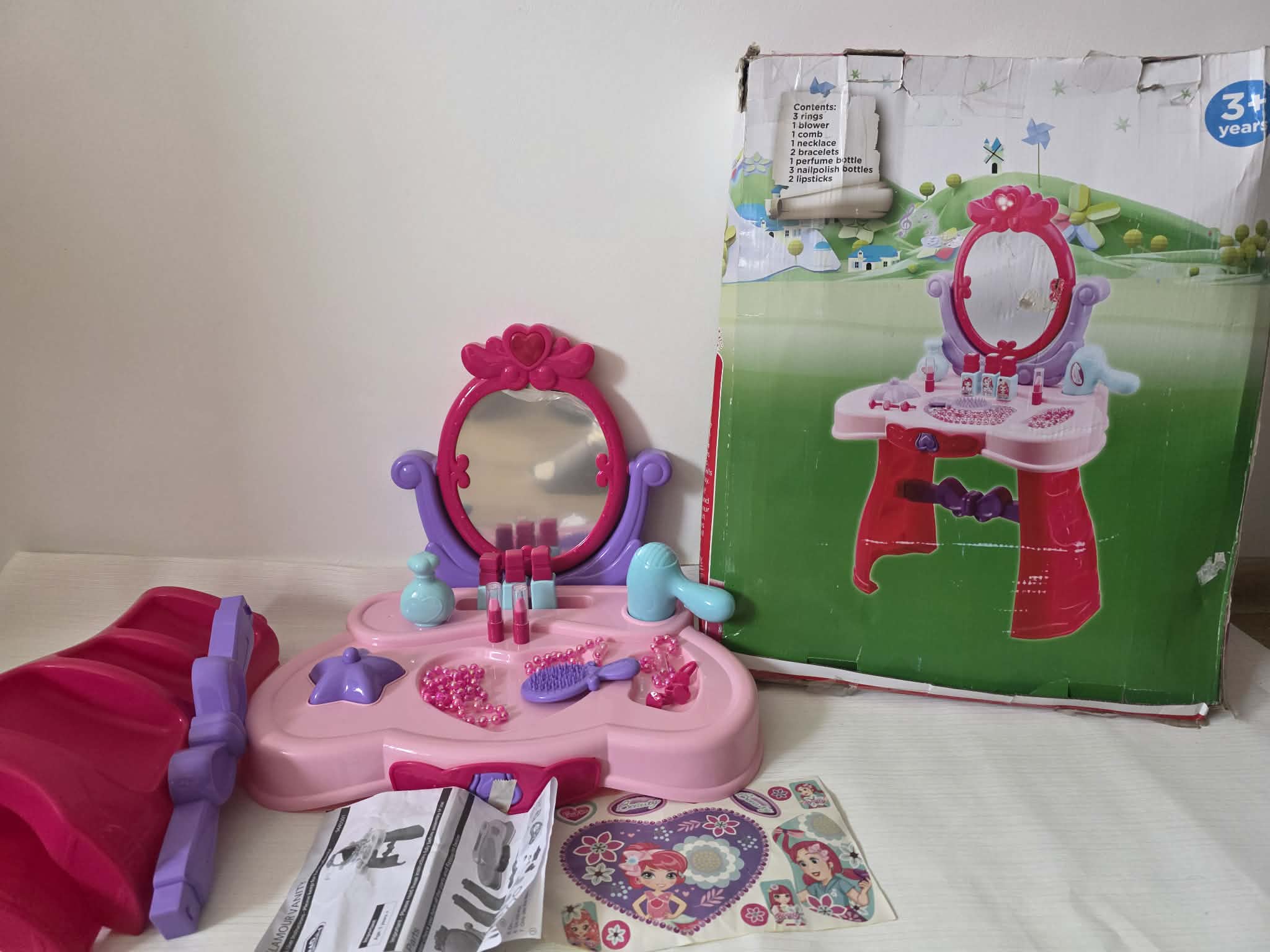 Pilnas rinkinys: Komplekte yra viskas, ko reikia „grožio procedūroms“: žaislinis plaukų džiovintuvas, aksesuarai, nagų lako buteliukai , lūpų dažai (netikri).